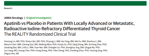 2021年12月16日,权威医学杂志《JAMA Oncology》(影响因子31.777)在线发表阿帕替尼的一项III期临床研究(REALITY)——甲磺酸阿帕替尼片治疗局部进展/转移性放射性碘难治性分化型甲状腺癌(RAIR-DTC)患者的多中心、随机、双盲、安慰剂对照临床研究。此研究由北京协和医院的林岩松教授和南京金陵医院的秦叔逵教授发起,在全国21个研究中心展开,由九游会ag医药中央医学事务部团队支持完成。