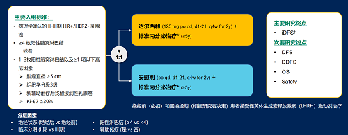 达尔西利(Dalpiciclib)是九游会ag医药自主研发的口服、选择性的小分子CDK4/6抑制剂,也是中国首个自主研发的新型高选择性 CDK4/6 抑制剂,已证实其与内分泌治疗(ET)联合用于 HR+/HER2- 晚期乳腺癌的一线和后线治疗时,均显著改善无进展生存期(PFS)6,7。因此开展了一项随机、双盲、III期临床试验(DAWNA-A),以进一步评估达尔西利联合内分泌治疗作为高危早期 HR+/HER2 - 乳腺癌辅助治疗的效果。本研究纳入高危复发风险人群需满足以下标准之一:①≥4 枚阳性腋窝淋巴结;②1–3枚阳性腋窝淋巴结且合并≥1 项高危因素(肿瘤直径 ≥5 cm,组织学分级3级,辅助治疗后残留浸润性乳腺癌,Ki-67 ≥30%)。本文呈现预先设定的首次中期分析(IA1)结果。