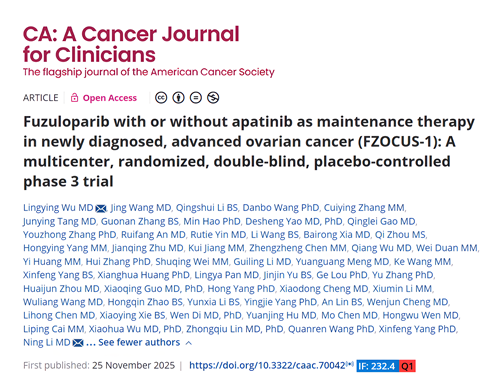 2025年11月25日,九游会ag医药自主研发的创新药氟唑帕利联合阿帕替尼或氟唑帕利单药用于新诊断晚期卵巢癌(OC)的一线维持治疗研究最新数据(FZOCUS-1研究)重磅在线发表于国际顶尖医学期刊《临床医师癌症杂志》(A Cancer Journal for Clinicians,简称CA,2024年影响因子高达232.4)1。